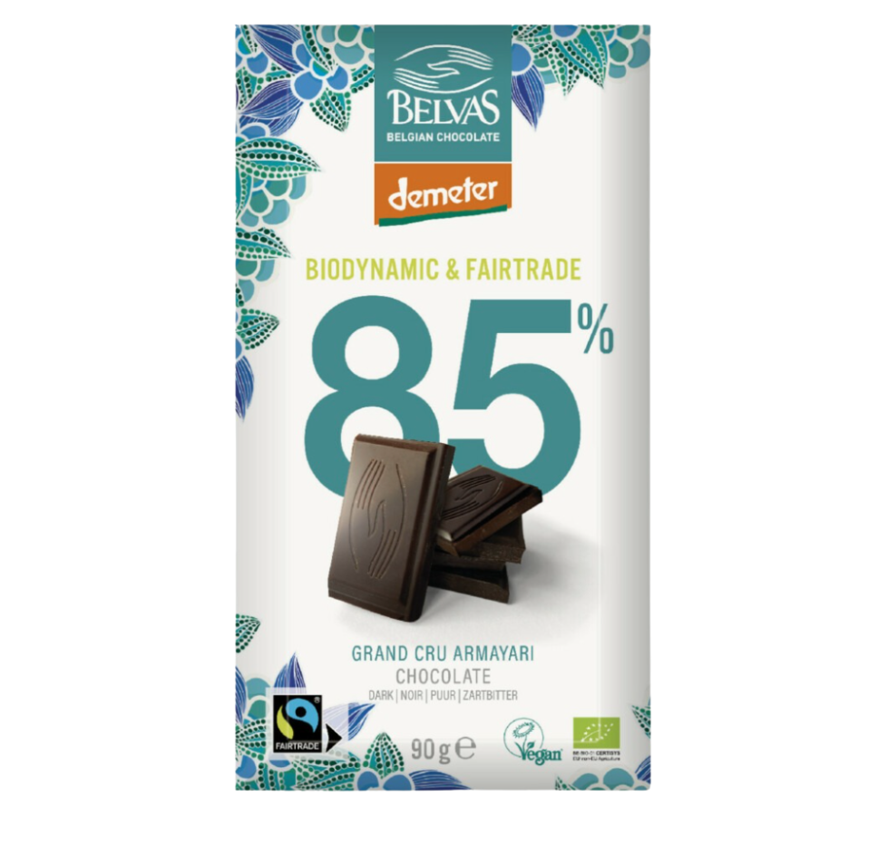 Oplev den intense smag af 85% mørk chokolade fra Belvas. Denne fairtrade delikatesse er skabt med omhu, for en bæredygtig fornøjelse uden kompromis. Også god til bagning.
