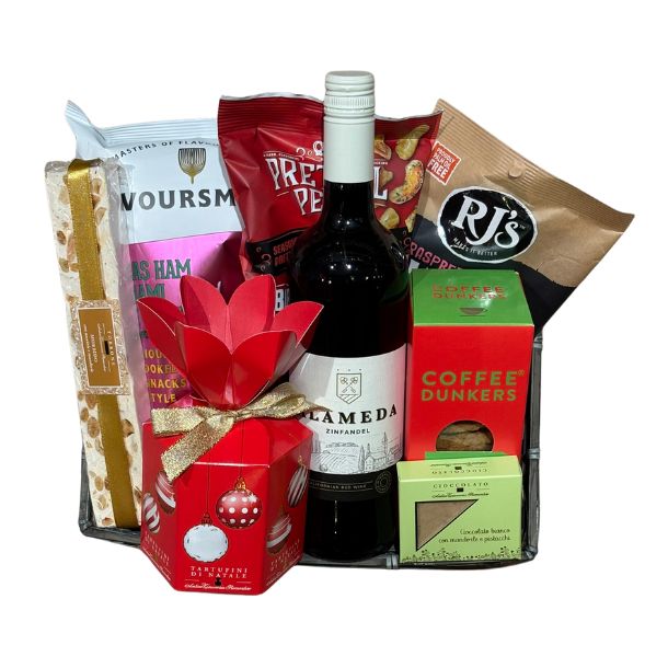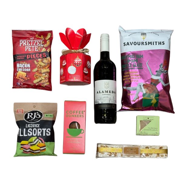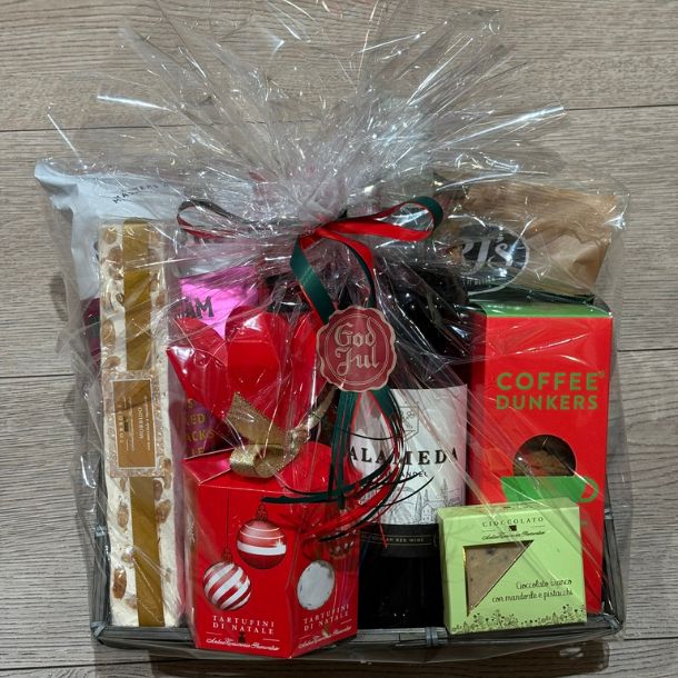 Forkæl dig selv eller en du holder af med rødvin, lækre Julechips, sprøde julesmåkager, himmelske chokolade trøfler med hasselnødder fra Pimonte, lakridskonfekt, bløde italiensk nougat, chokolade, og Pretzels.