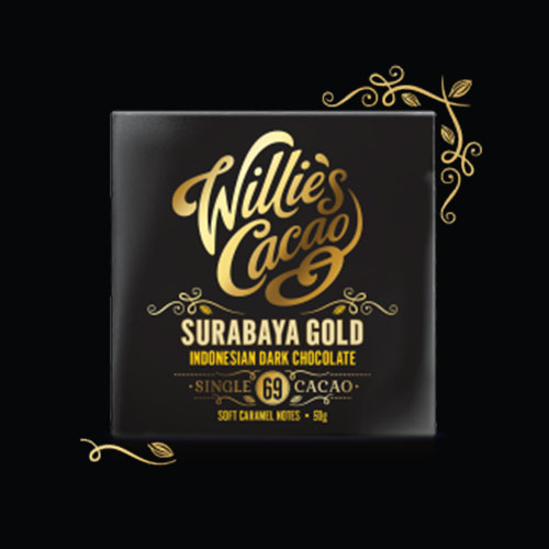 Willie's cacao Surabaya Gold er en 69% indonesisk mørk chokolade karakteriseret ved sine bløde noter af karamel og toffee.
