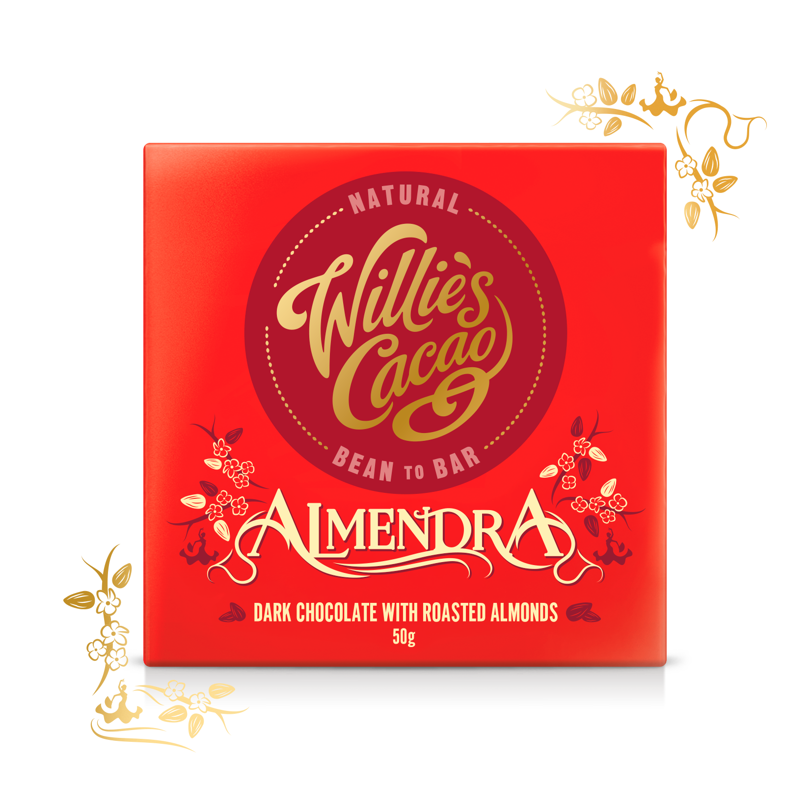 Willie's cacao Almendra er en 70% mørk chokolade med ristede mandler lavet på venezuelanske single estate kakaobønner.