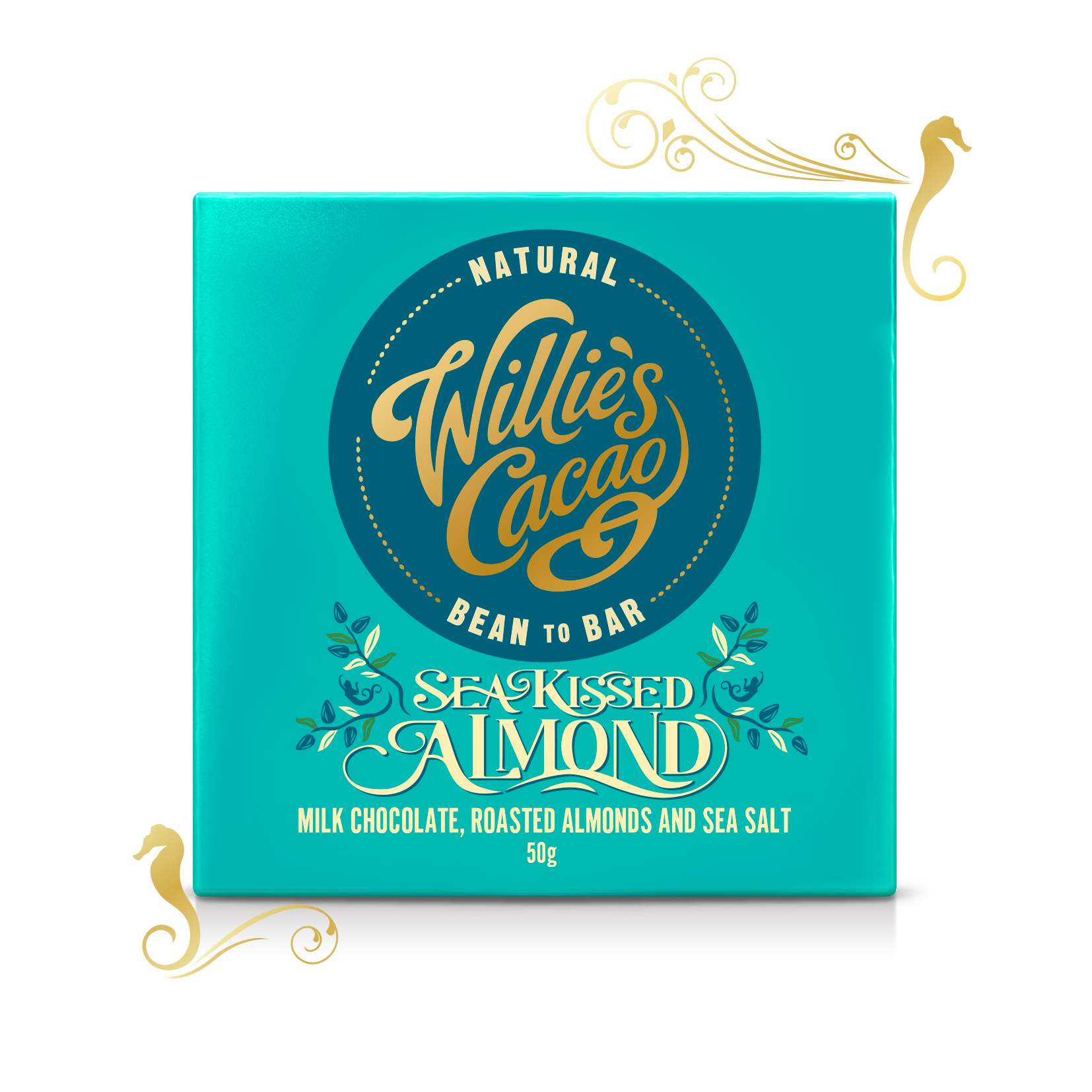 Willie's cacao Sea Kisser Almond er en luksus mælkechokolade med ristede mandler og et lækkert drys havsalt.