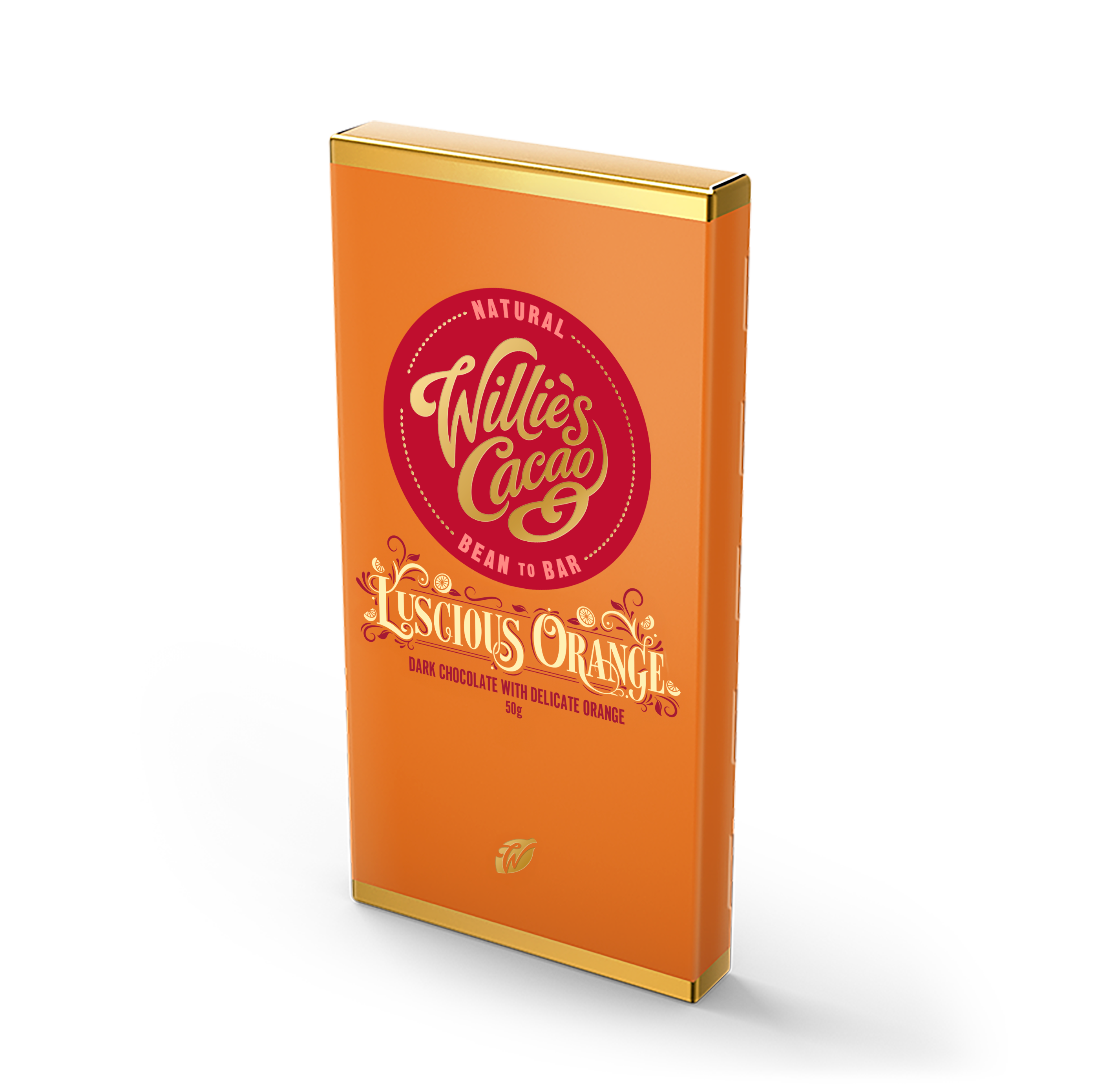 Willie's cacao Luscious Orange er en mørk chokolade med delikat appelsin lavet på single estate kakaobønner fra Baracoa med distinkte noter af honning.
